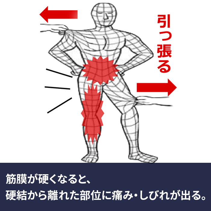 偏った使い方などにより筋膜が硬くなると、繋がっている別の部位が引っ張られ、その結果として筋膜の硬結から離れた部位に痛み・しびれが生じます。