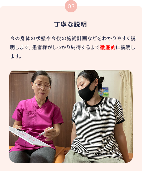 「え!?こんなに優しい施術なの!?」と、ほとんどの方が驚くほどソフトな施術で根本原因を取り除いていきます.バキバキは一切しません。症状を再発させないために、自宅でできるセルフセアもお伝えします。
